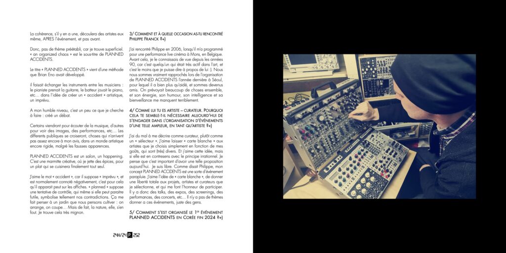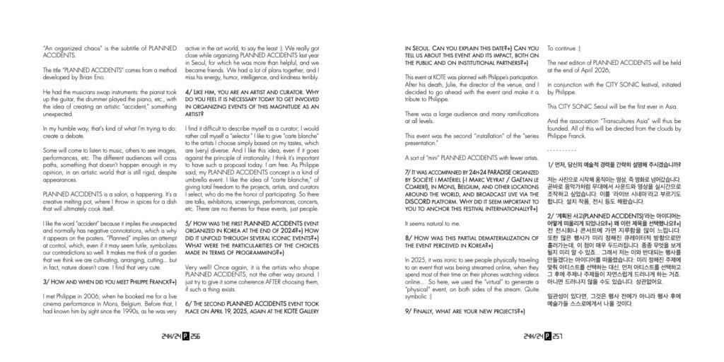 This is a recent and very spontaneous interview, unedited, in which I speak very simply and mainly about my PLANNED ACCIDENTS project. There is an English and Korean translation on pages 3, 4, and 5.